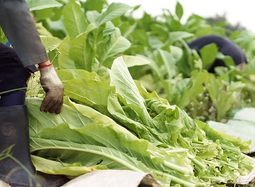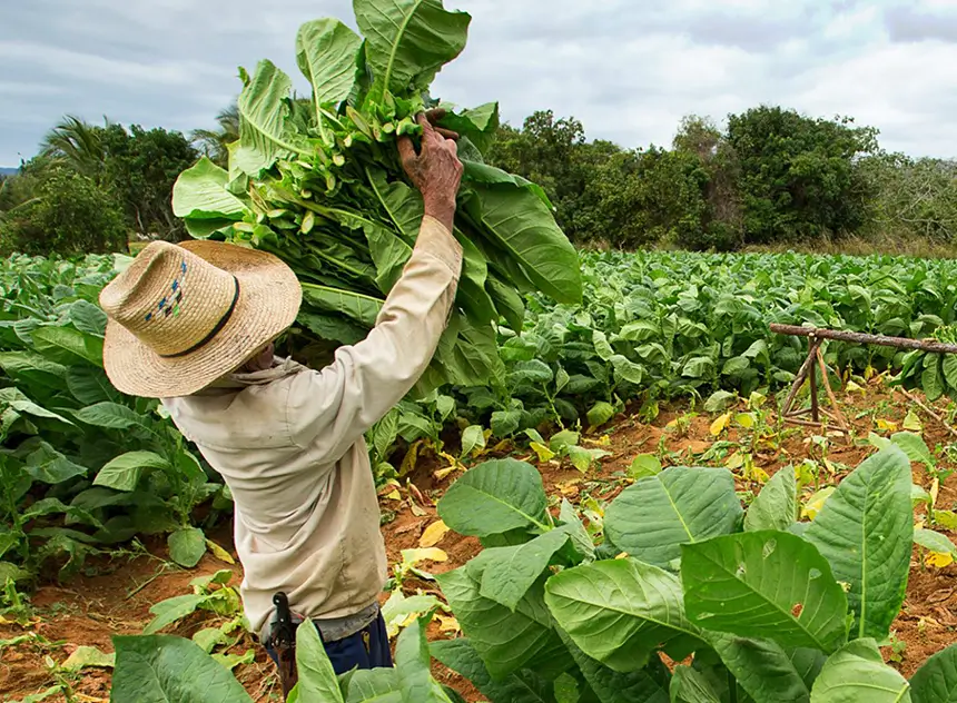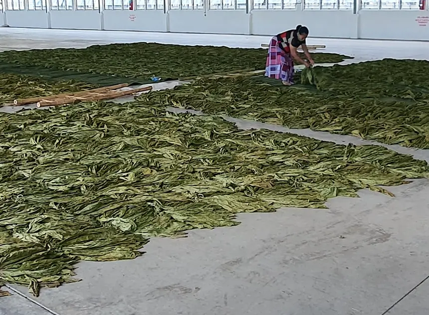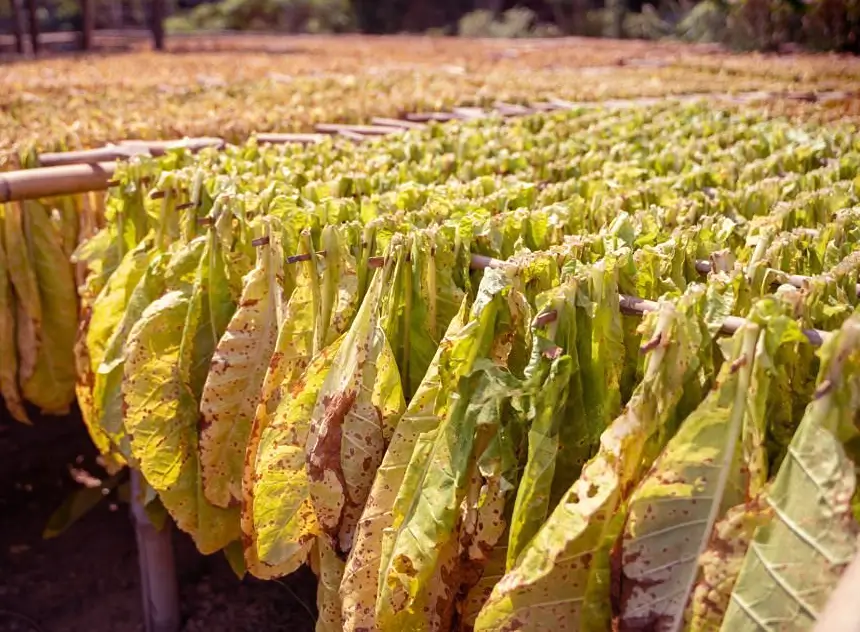 After about 50 days in the field, mature tobacco leaves are carefully harvested by picking two leaves at a time, starting from the bottom. Harvest timing depends on leaf maturity. The harvested leaves are then sent to curing barns, where they undergo traditional air curing, a drying process that takes approximately two to four weeks.